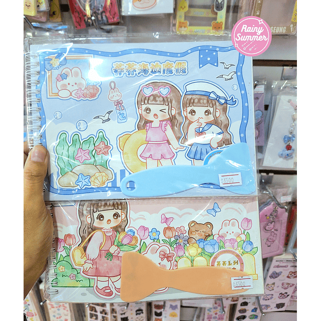 Las libretas son A5, son 2 modelos de en donde lo único que cambia es el diseño de la portada. Cada libreta lleva 26 hojas de 21,0 x 14,8 cm las cuales se pueden utilizar por ambos lados para coleccionar y guardar stickers (el material de las hojas les permite pegar y despegar los stickers cuantas veces quieran ♡). Las libretas incluyen espátulas para que les ayude a pegar los stickers ♡.