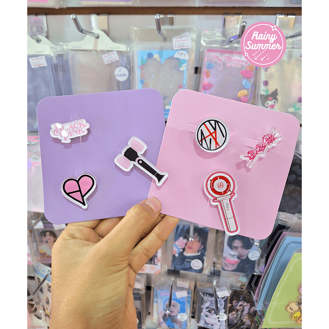 Cada set contiene 3 pins de acrílico en donde aparecen la lightstick del grupo al igual que sus respectivos logos ♡. Los pins son con gancho alfiler, perfectos para decorar totebags, bolsos, mochilas, etc.
